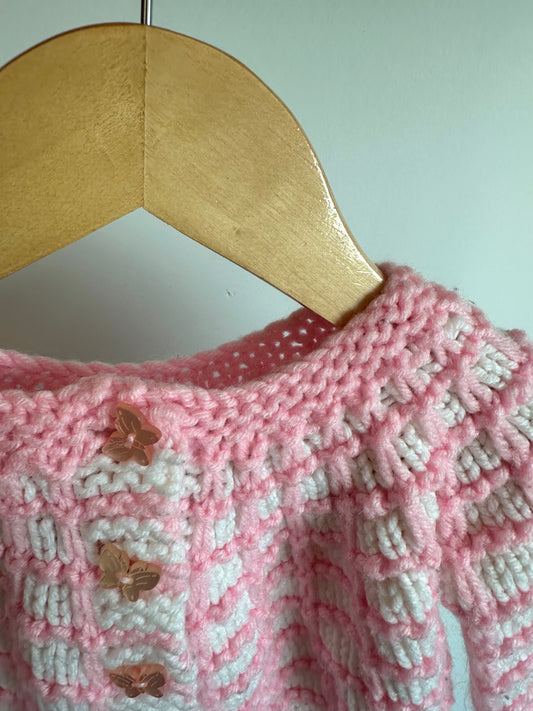 Handmade Knit Pink + White Cardigan/ 3-6m