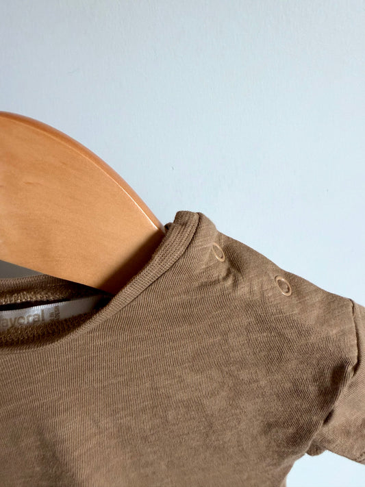 Tan Vertical Stripe Short Overalls + T-shirt Set / 3-6m