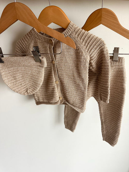 Oat Knit Cardigan, Pants Toque Set / 9m
