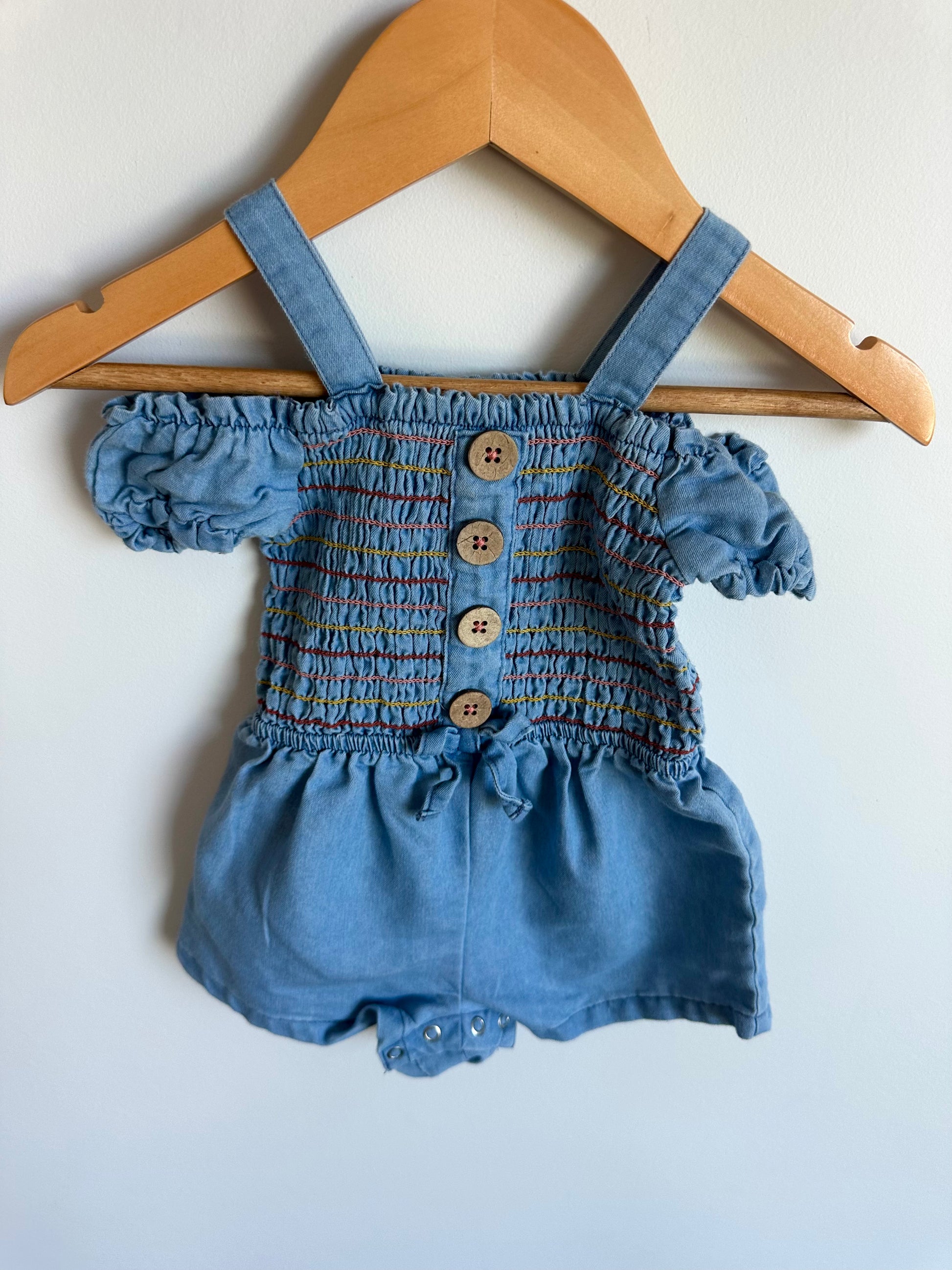 Chambray Rousing Sleeve Detail Romper / 12m